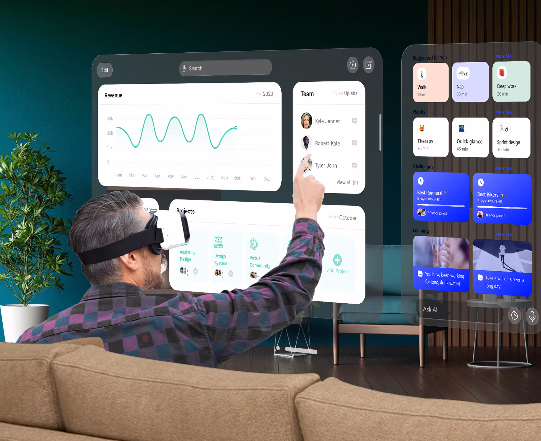 I began with competitive analysis of productivity platforms and VR tools, mapped remote worker pain points, and created conceptual user journeys. From there, I sketched wireframes, designed 3D spaces, and prototyped key flows in Unity and Figma. Iteration focused on simplifying VR onboarding, balancing AI prompts with usability, and ensuring multi-platform continuity.