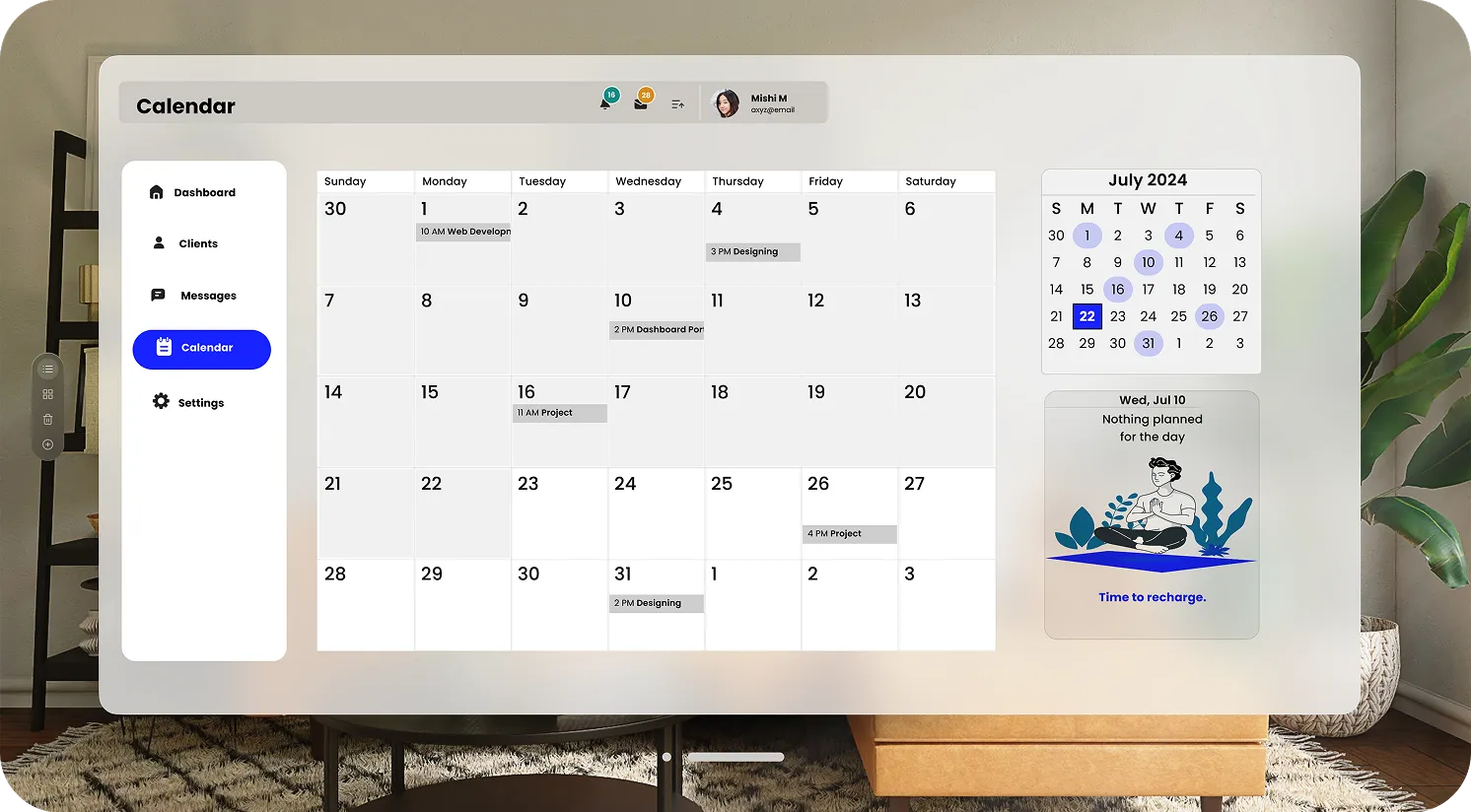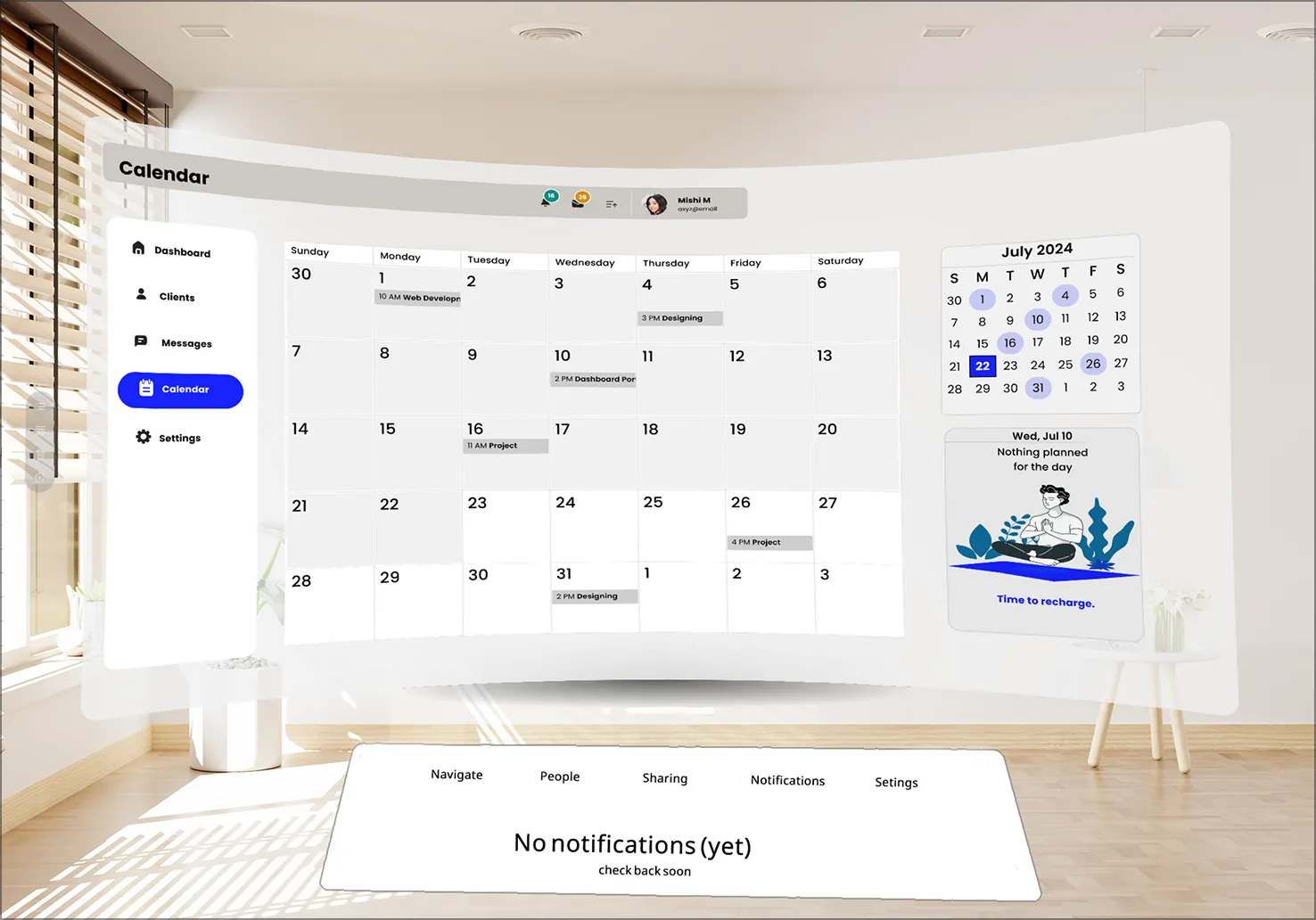 The solution combined immersive 3D environments for collaboration with AI task prioritization, meeting assistants, and well-being tools. Focus features helped users protect time for deep work, while dashboards provided visibility into workload balance. Designed to scale across VR, desktop, and mobile, the platform blended futuristic immersion with everyday usability.
